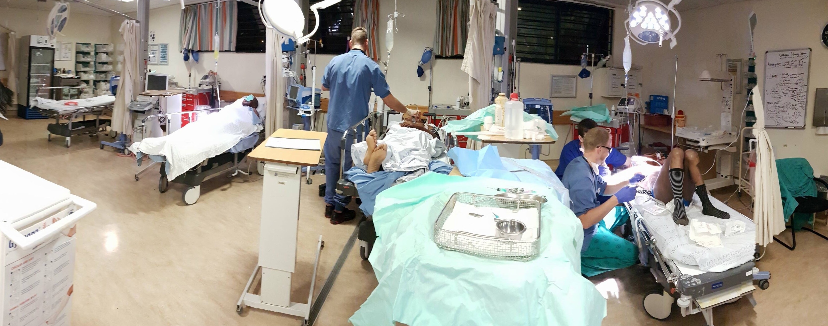 Jag är just nu tillbaka i Kapstaden och jobbar på akuten på Khayelitsha district hospital (KDH) som ligger i en fattig förort med mycket våld och extremt hög HIV- och TB-prevalens. På KDH finns det tre akutläkare som jobbar dagtid och turas om att vara jour i hemmet resten av dygnet. Akuten sköts av fyra olika team som jobbar i treskift ca 60-65 timmar i veckan. Varje team leds av en medical officer (MO) som gjort AT och ett års obligatorisk community service. I Sydafrika specialiserar sig inte alla utan många fortsätter som MOs hela karriären men riktar oftast in sig på ett visst område och får där mer och mer ansvar. Det finns t.ex. erfarna MOs som jobbar självständigt som kirurger men som alltså aldrig genomgått en ST. Det verkar vara vanligare på mindre sjukhus och på de större verkar de flesta behöva specialisera sig för att avancera i karriären. Khayelitshas MOs är enormt duktiga kliniker. Under jourtid sköter de självständigt resusciteringar av svårt skadade traumapatienter såväl som multisjuka patienter i djup chock men kan vid behov konsultera en akutläkarspecialist som dock extremt sällan behöver komma in. Kommunikationen sker via telefon och röntgenbilder, ultraljudsfilmer, EKG m.m. skickas vid behov via whatsapp (som faktiskt är säkrare än sms). MOs intuberar, sätter CVKer och artärnålar, sköter ventilator, sedering och inotropi, utför thorakotomier (vilket dock görs sällan och bara om det finns en tydlig indikation), tar hand om svårt sjuka spädbarn, tolkar alla röntgenbilder, gör ultraljud och allt annat som behöver göras akut. På KDH finns ingen IVA och ofta kan det dröja länge innan man får till en transport till det stora sjukhuset Tygerberg inne i Kapstaden, så därför blir ofta akutrummet som en mini-IVA med intuberade patienter med slangar överallt och ett antal olika pumpar med diverse läkemedel. Som svensk akutläkare behöver man verkligen vässa vissa färdigheter  (intubering, CVK, thoraxdrän mm) innan man åker hit men har man gjort det så kan man få ut ännu mer av tiden här.