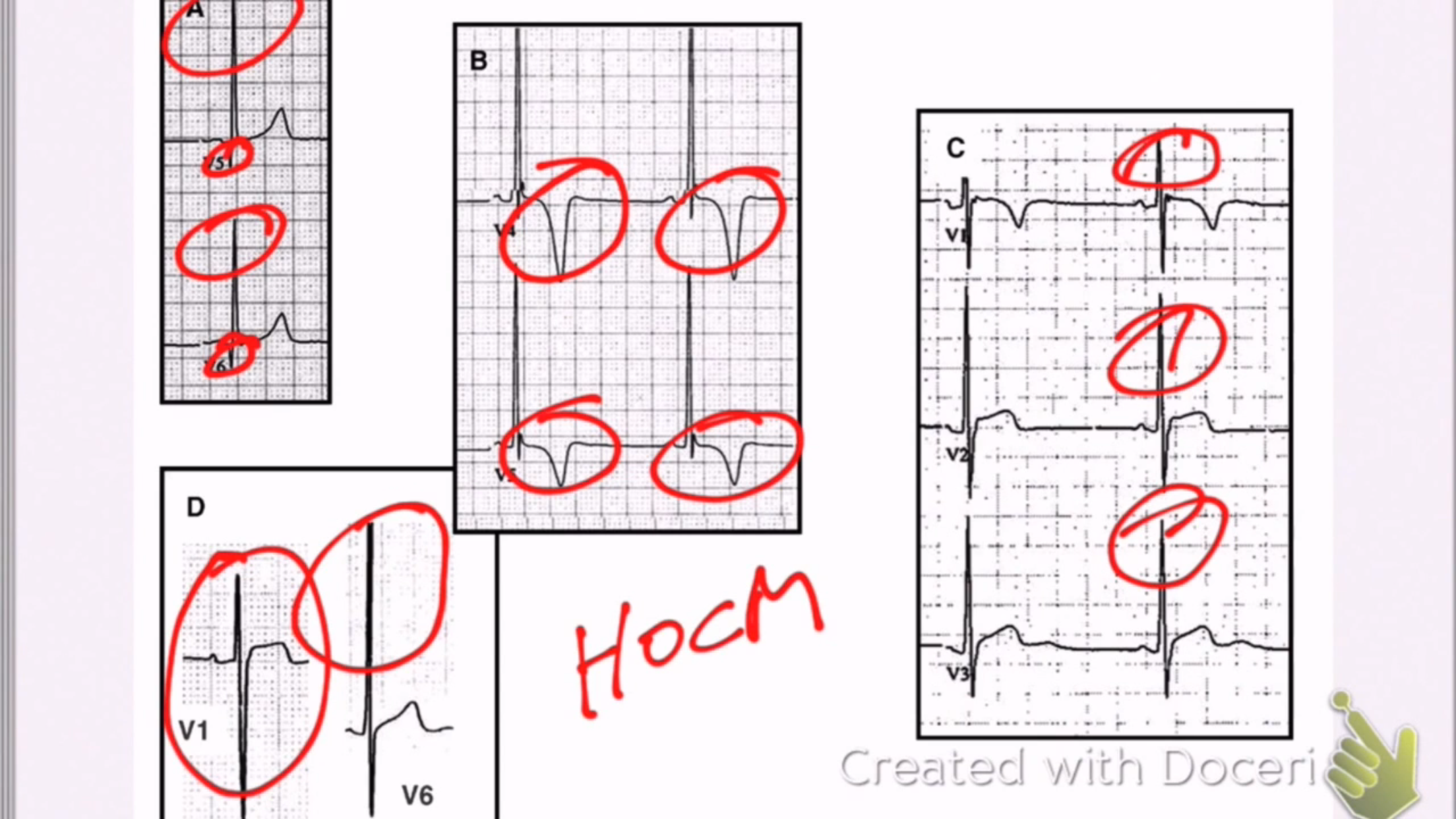 – HCM/Hypertrof kardiomyopati: Höga, spetsiga R-taggar och nålliknande S. Vanligaste orsaken till plötslig hjärtdöd hos yngre. Näst vanligaste är arytmogen högerkammarkardiomyopati.